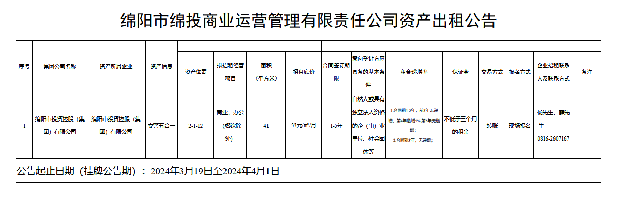 綿陽市綿投商業(yè)運營管理有限責(zé)任公司資產(chǎn)出租公告