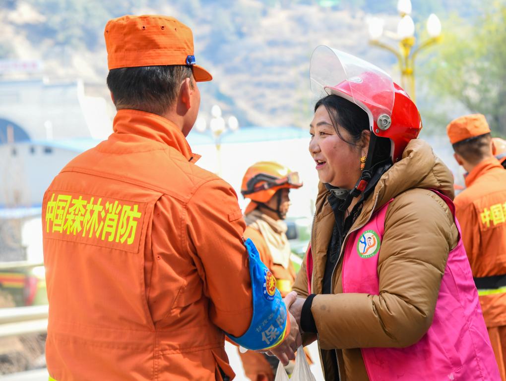 3月18日,在四川省甘孜藏族自治州雅江縣,四川省森林消防總隊(duì)的消防員感謝彭三妹(前右)送來饃饃。