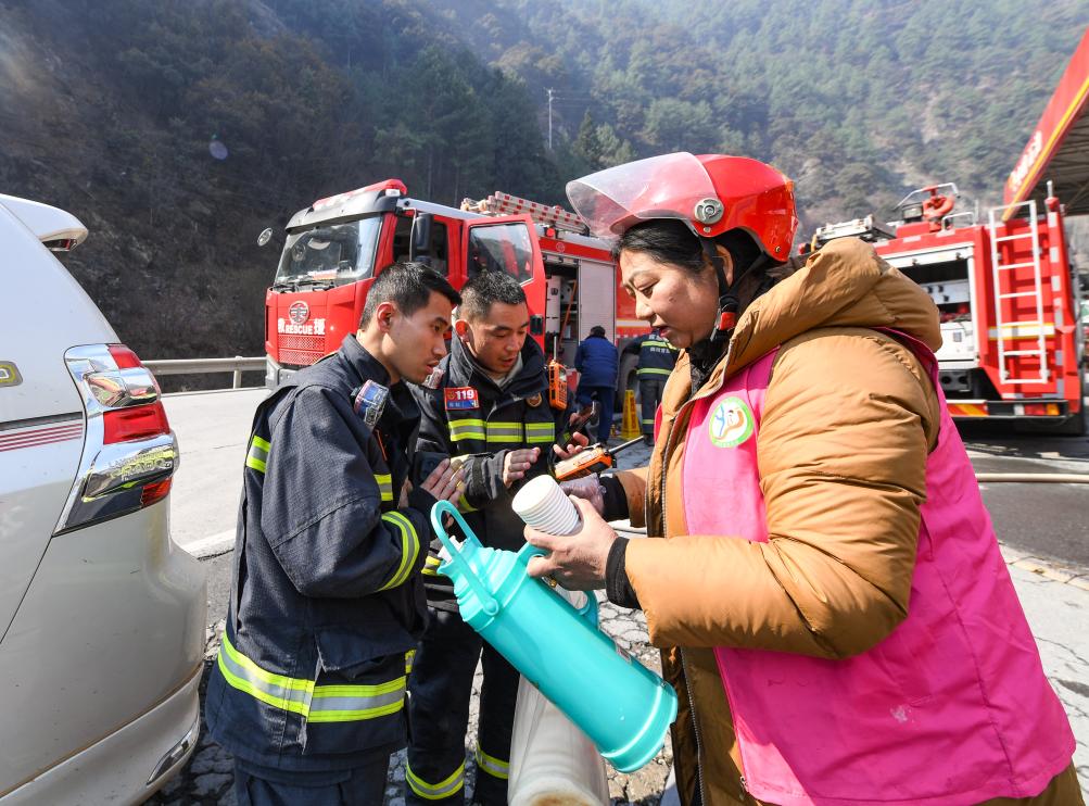 3月18日,在四川省甘孜藏族自治州雅江縣,彭三妹(右)為剛從火場(chǎng)撤下來的消防員送上饃饃和熱水。