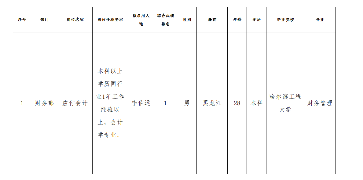 根據(jù)長虹三杰新能源公司發(fā)布的招聘公告及招聘相關(guān)規(guī)定,經(jīng)筆試、面試、體檢等程序,擬錄用李伯遠(yuǎn)同志到財務(wù)部工作,現(xiàn)予以公示,具體情況如下:
