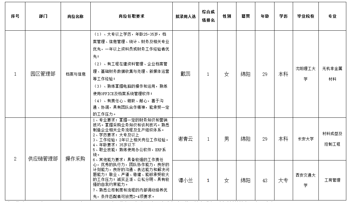 根據(jù)四川愛(ài)創(chuàng)科技有限公司發(fā)布的招聘公告及招聘相關(guān)規(guī)定,經(jīng)面試、考察、體檢等程序,擬錄用戴蕊、謝青云、譚小蘭等三位同志到園區(qū)管理部、供應(yīng)鏈管理部工作,現(xiàn)予以公示,具體情況如下: