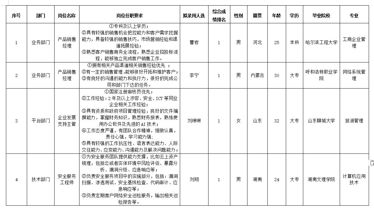 根據(jù)四川長虹佳華信息產(chǎn)品有限責任公司發(fā)布的招聘公告及招聘相關(guān)規(guī)定,經(jīng)面試、考察、體檢等程序,擬錄用曹巖、李寧、劉琳琳、劉翔同志到四川長虹佳華信息產(chǎn)品有限責任公司工作,現(xiàn)予以公示,具體情況如下: