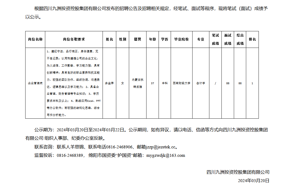 四川九洲投資控股集團(tuán)有限公司關(guān)于招聘企業(yè)管理崗成績的公示