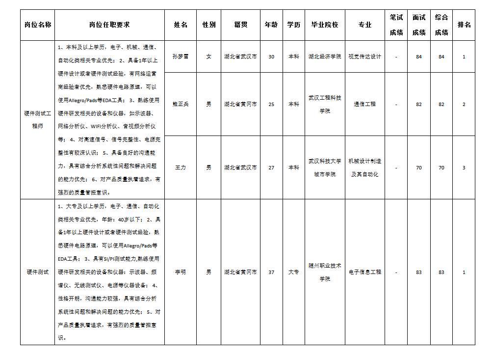 根據(jù)四川九州電子科技股份有限公司發(fā)布的招聘公告及招聘相關(guān)規(guī)定,經(jīng)筆試、面試等程序,現(xiàn)將筆試(面試)成績(jī)予以公示。