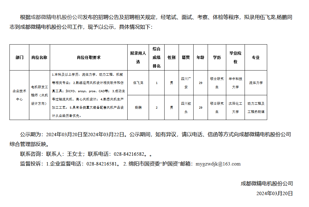成都微精電機股份公司關(guān)于招聘電機研發(fā)工程師(風機設(shè)計方向)崗擬錄用人員的公示