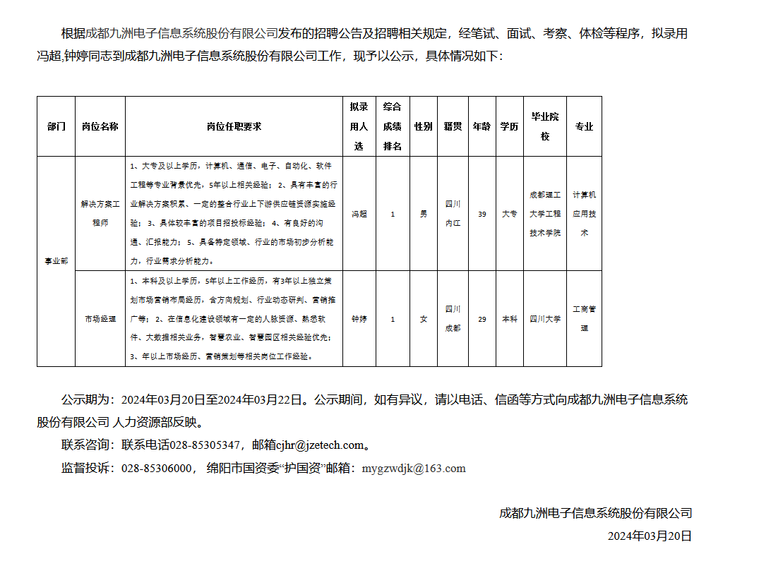 成都九洲電子信息系統(tǒng)股份有限公司關(guān)于招聘解決方案工程師等崗位擬錄用人員的公示