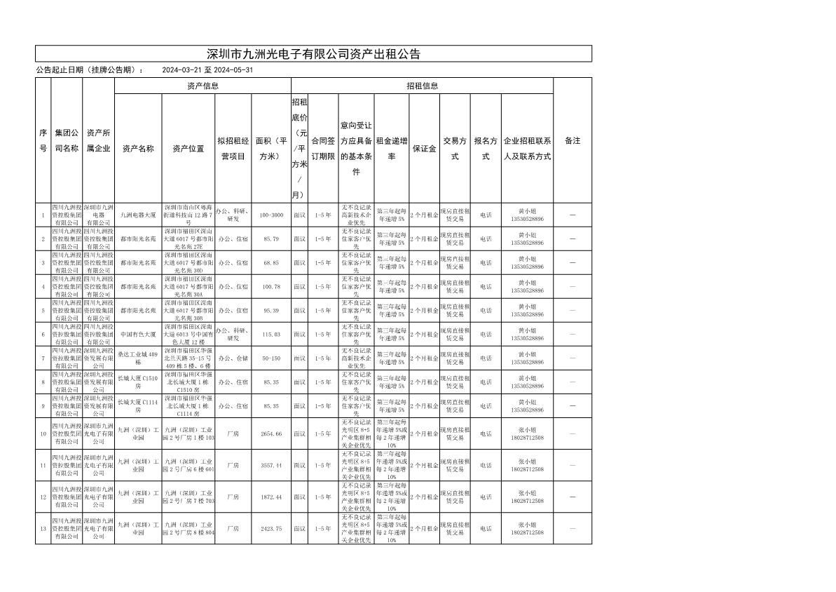 深圳市九洲光電子有限公司資產(chǎn)出租公告