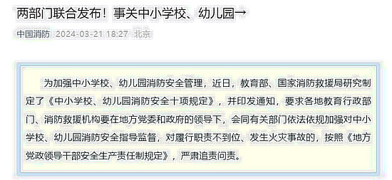 為加強中小學校、幼兒園消防安全管理,近日,教育部、國家消防救援局研究制定了《中小學校、幼兒園消防安全十項規(guī)定》,并印發(fā)通知,要求各地教育行政部門、消防救援機構(gòu)要在地方黨委和政府的領(lǐng)導下,會同有關(guān)部門依法依規(guī)加強對中小學校、幼兒園消防安全指導監(jiān)督,對履行職責不到位、發(fā)生火災(zāi)事故的,按照《地方黨政領(lǐng)導干部安全生產(chǎn)責任制規(guī)定》,嚴肅追責問責。