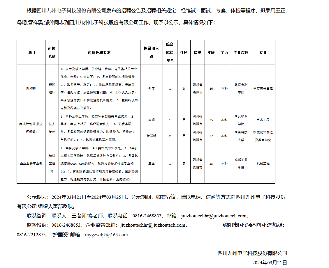 四川九州電子科技股份有限公司關(guān)于招聘結(jié)構(gòu)工程師崗位等擬錄用人員的公示
