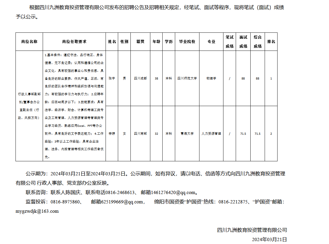 四川九洲教育投資管理有限公司關(guān)于招聘行政人事部副部長/董事會辦公室副主任(行政、風(fēng)控方向)成績的公示