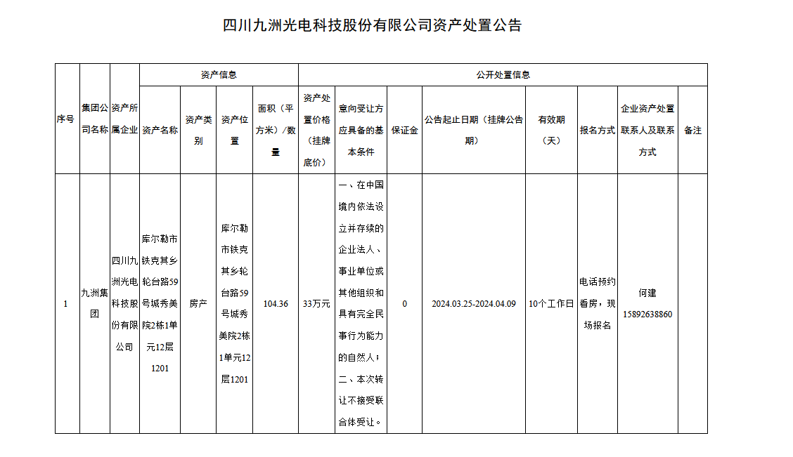 四川九洲光電科技股份有限公司資產(chǎn)處置公告