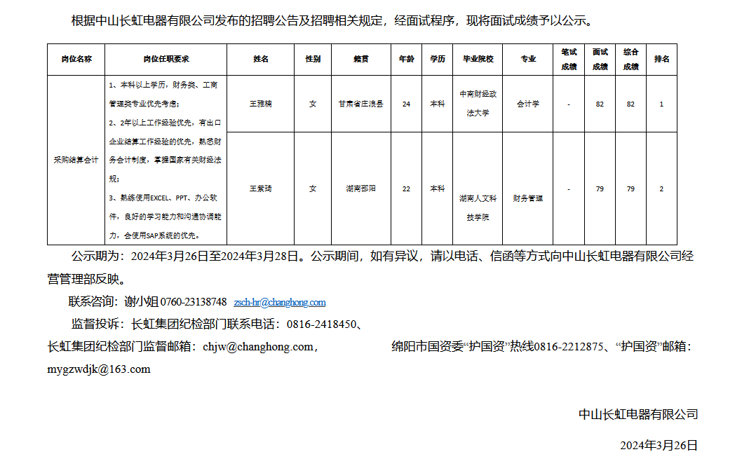 中山長虹電器有限公司關(guān)于招聘采購結(jié)算會計(jì)成績的公示