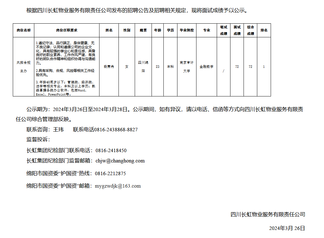 四川長虹物業(yè)服務有限責任公司關于招聘風控合規(guī)主辦成績的公示