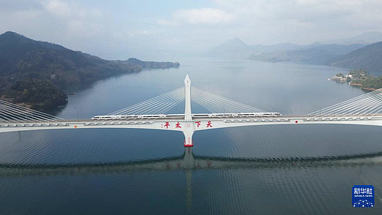 3月26日,池黃高鐵試運行列車行駛在黃山市黃山區(qū)太平湖特大橋上(無人機照片)。新華社發(fā)(陳蘇青攝)