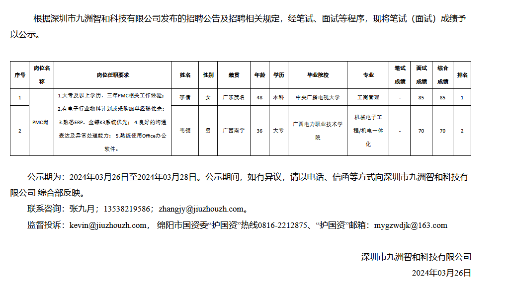 深圳市九洲智和科技有限公司關(guān)于招聘PMC崗成績的公示