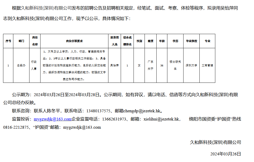 久和新科技(深圳)有限公司關(guān)于招聘行政人事崗擬錄用人員的公示