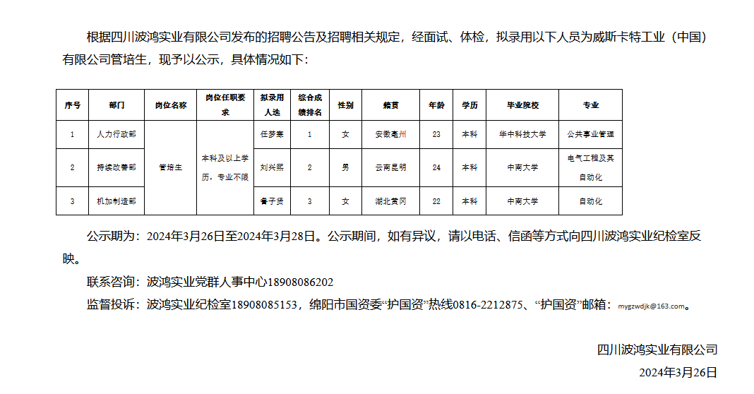 四川波鴻實業(yè)有限公司關(guān)于招聘威斯卡特工業(yè)(中國)有限公司管培生擬錄用人員的公示