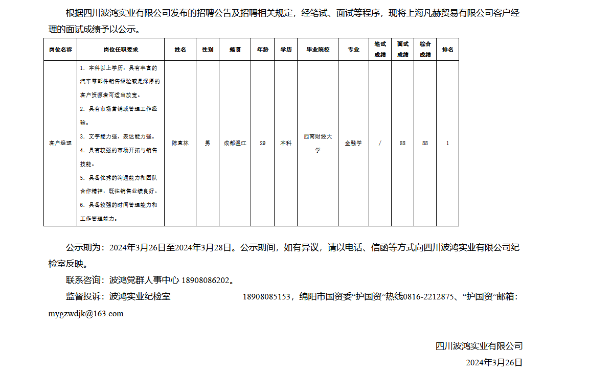 四川波鴻實(shí)業(yè)有限公司關(guān)于招聘上海凡赫貿(mào)易有限公司客戶經(jīng)理成績(jī)的公示