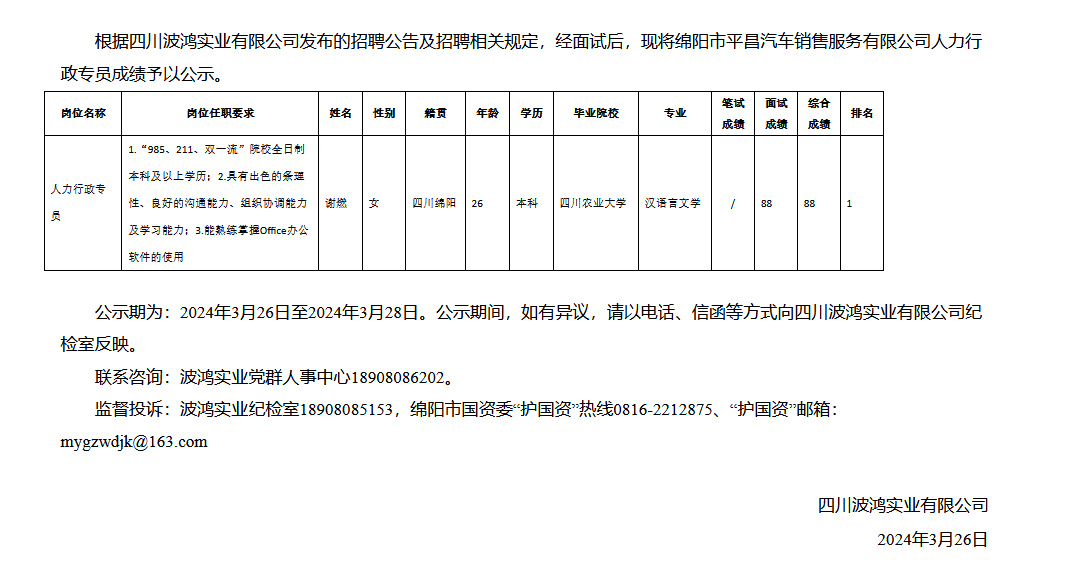 四川波鴻實(shí)業(yè)有限公司關(guān)于招聘綿陽(yáng)市平昌汽車銷售服務(wù)有限公司人力行政專員成績(jī)的公示