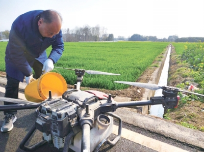 調(diào)配農(nóng)藥、調(diào)試無(wú)人機(jī)、預(yù)設(shè)播灑區(qū)域……在園區(qū)天竺村的麥田、油菜地里,伴隨著陣陣轟鳴聲,輕巧的農(nóng)業(yè)無(wú)人機(jī)滿載著農(nóng)藥從地頭起飛,距作物兩米高處飛越蔥綠的麥苗,灑下細(xì)密的藥?kù)F。