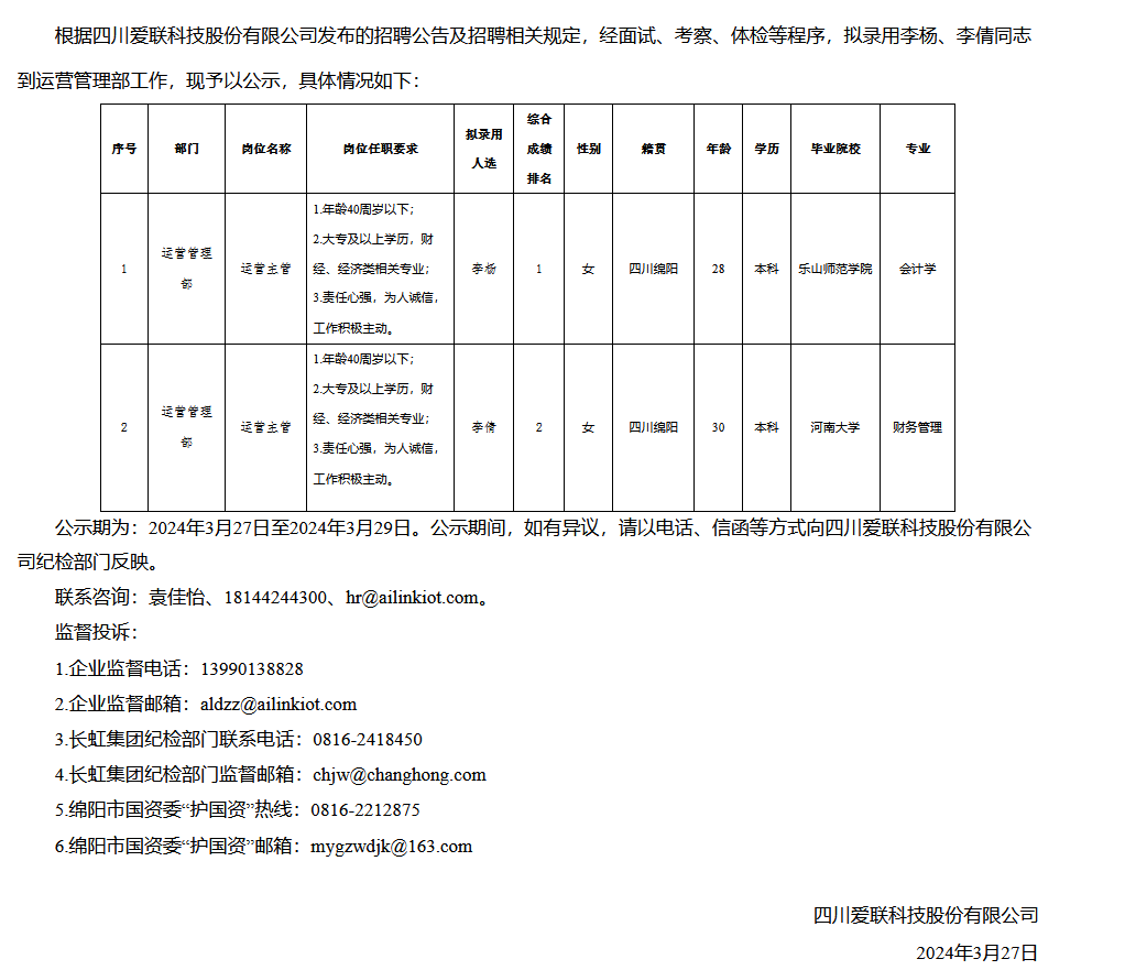 四川愛聯(lián)科技股份有限公司關(guān)于招聘運(yùn)營(yíng)主管擬錄用人員的公示