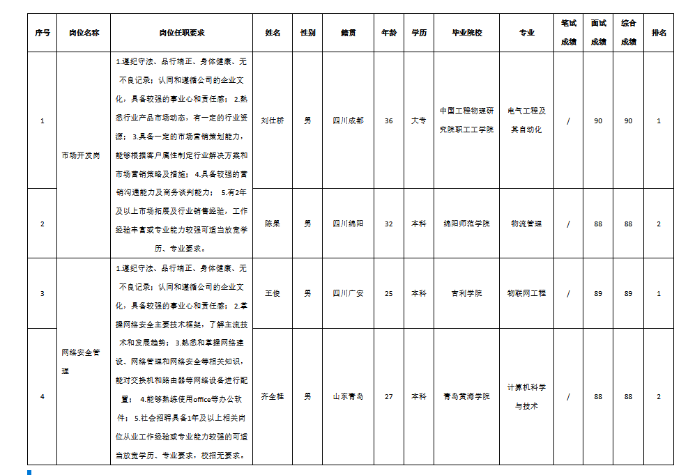 根據(jù)四川九強(qiáng)通信科技有限公司發(fā)布的招聘公告及招聘相關(guān)規(guī)定,經(jīng)筆試、面試等程序,現(xiàn)將筆試(面試)成績予以公示。