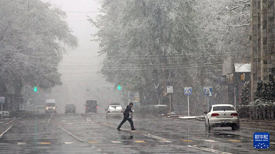 3月28日,在吉爾吉斯斯坦首都比什凱克,一名行人在強(qiáng)風(fēng)中穿過馬路。新華社發(fā)(羅曼攝)
