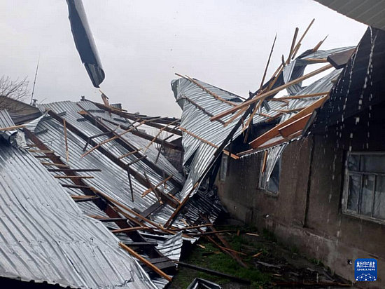 3月28日,在吉爾吉斯斯坦首都比什凱克,一處房屋的屋頂被強(qiáng)風(fēng)吹落。新華社發(fā)(羅曼攝)