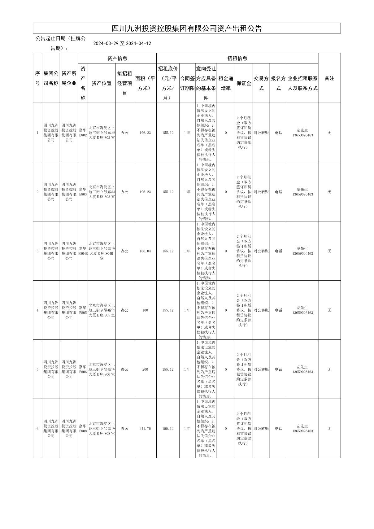 四川九洲投資控股集團(tuán)有限公司資產(chǎn)出租公告