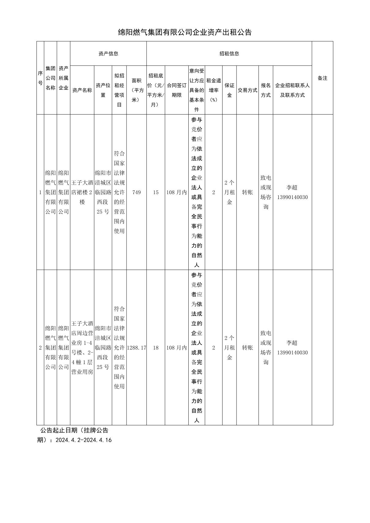 綿陽燃氣集團有限公司企業(yè)資產(chǎn)出租公告