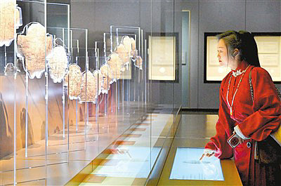 參觀者在河南安陽(yáng)殷墟博物館新館內(nèi)觀看展出的刻辭卜甲。新華社記者 李 安攝