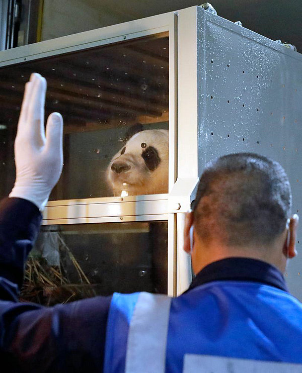 4月3日晚,旅韓大熊貓“福寶”搭乘專機抵達成都雙流國際機場后,準備乘車前往中國大熊貓保護研究中心臥龍神樹坪基地進行隔離檢疫。新華社記者 沈伯韓 攝