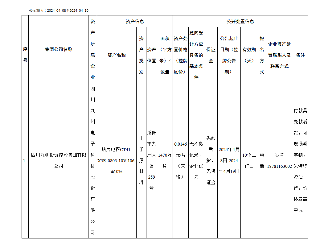 四川九州電子科技股份有限公司資產(chǎn)處置公告