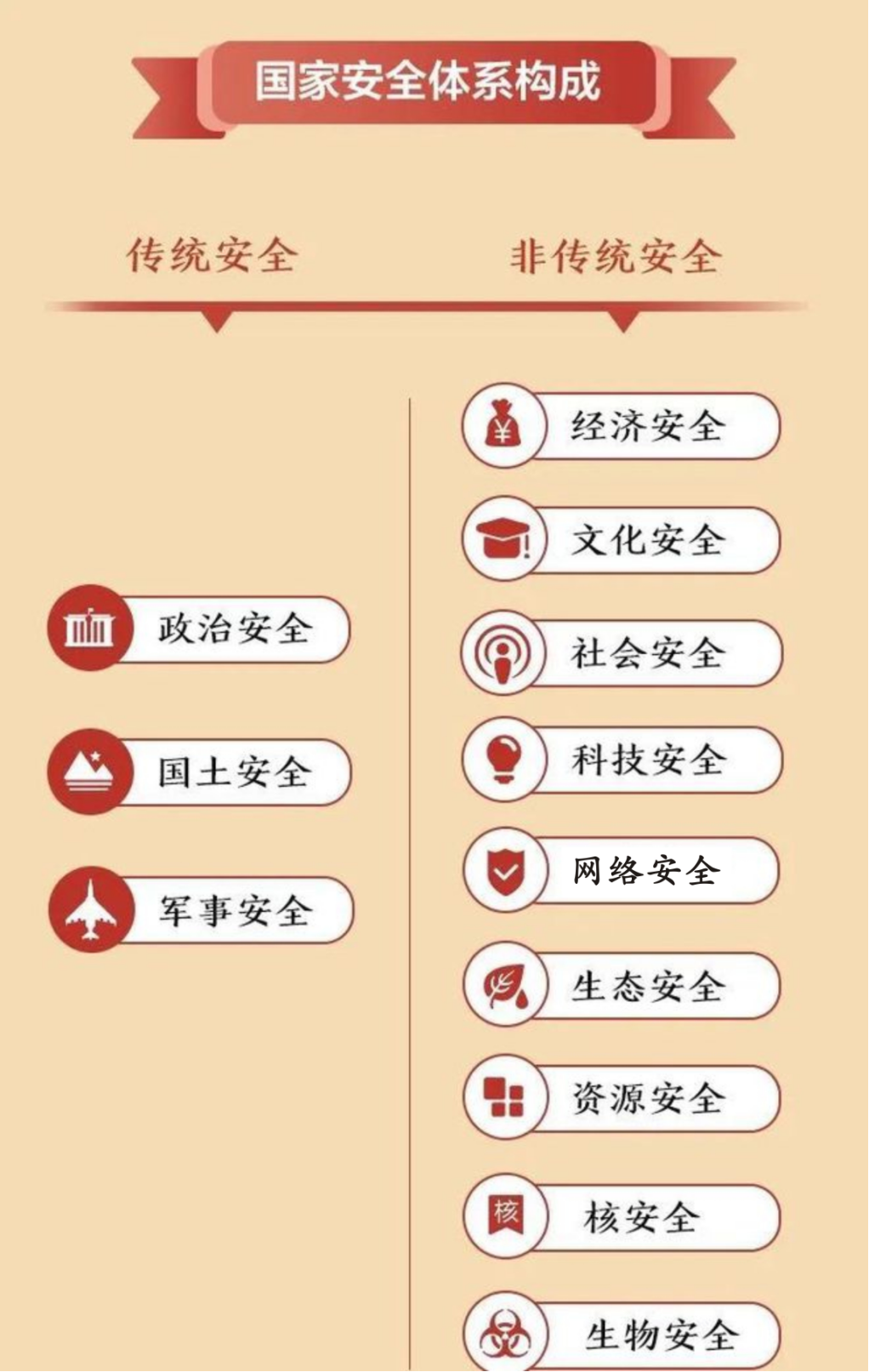國家安全涉及的16個(gè)重點(diǎn)領(lǐng)域包括:政治安全、國土安全、軍事安全、經(jīng)濟(jì)安全、文化安全、社會(huì)安全、科技安全、網(wǎng)絡(luò)安全、生態(tài)安全、資源安全、核安全、海外利益安全、生物安全、太空安全、深海安全、極地安全等。