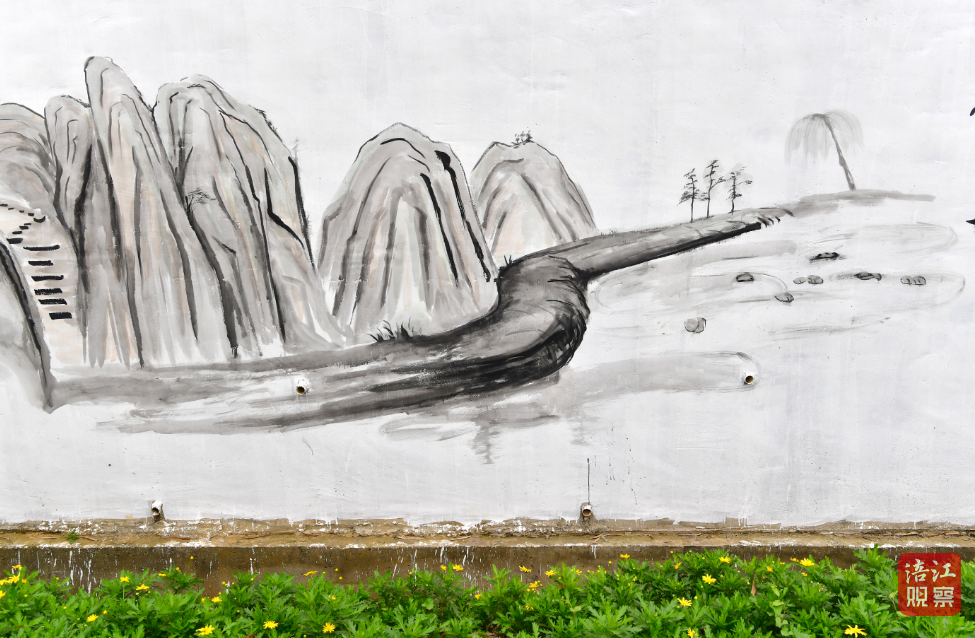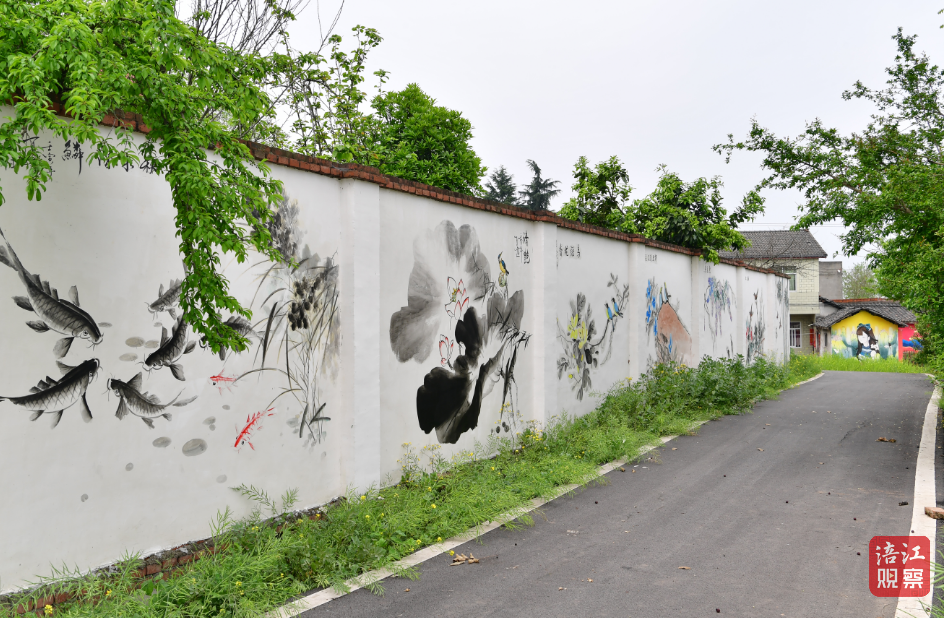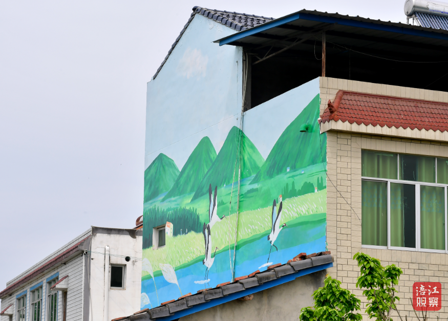 墻繪內(nèi)容除了國寶大熊貓、仙鶴、金魚、飛鳥等,還有傳統(tǒng)的閣樓建筑、巨幅山水、稻谷豐收和人物等圖案,使原本空落落的墻面煥然一新。