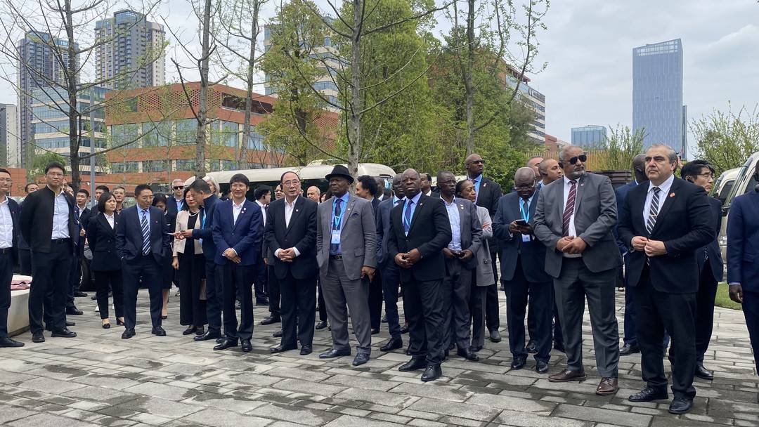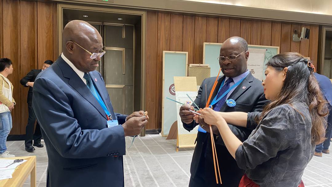 剛果(金)駐華大使巴盧穆埃內(nèi)、加蓬駐華大使波德萊爾·恩東·埃拉體驗了竹編
