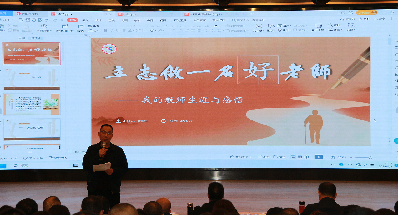 時光漫卷書頁過,只覺芳氣滿閑軒。儀式伊始,甘寒松先生為開中全體教師舉行了一場《立志做一名好老師》的講座。在近一個半小時的講座中,甘寒松校長多次強調(diào),一個好老師要培養(yǎng)學(xué)生的自學(xué)能力,而自學(xué)能力的培養(yǎng)則必須從提高閱讀能力開始,正如他所說:“教育者要先受教育。”這些教育來自日日夜夜、勤耕不輟地與賢者的心靈對話,在對話中成長,在對話中探索思考,在對話中進行教育實踐。甘老先生雖已白發(fā)蒼蒼,然精神矍鑠,在講座時聲如洪鐘,旁征博引,滔滔不絕。講座中全體教師全神貫注,或記或思,皆臣服于甘老先生的偉大教育情懷中。