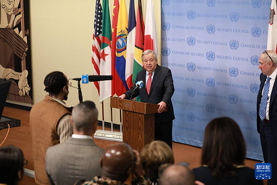 4月15日,在位于紐約的聯(lián)合國總部,聯(lián)合國秘書長古特雷斯(中)舉行記者會。新華社記者 謝鍔 攝