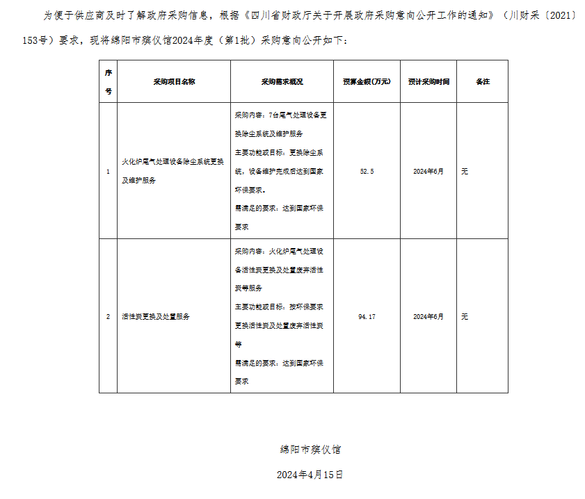 綿陽市殯儀館2024年度政府采購意向公告(第1批)