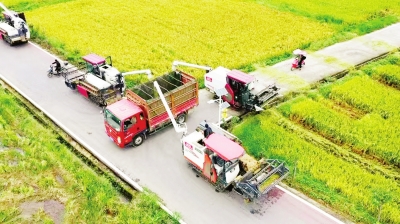 三臺縣農作物的機械化收割。 (郭超英 攝)