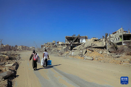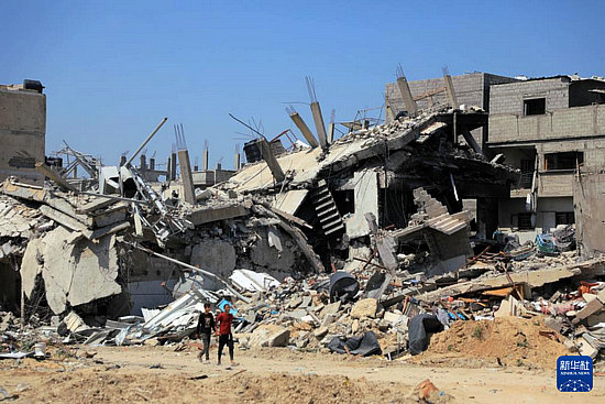 4月16日,在加沙地帶南部城市汗尤尼斯,人們走過損毀的建筑。新華社發(fā)(里澤克·阿卜杜勒賈瓦德攝)