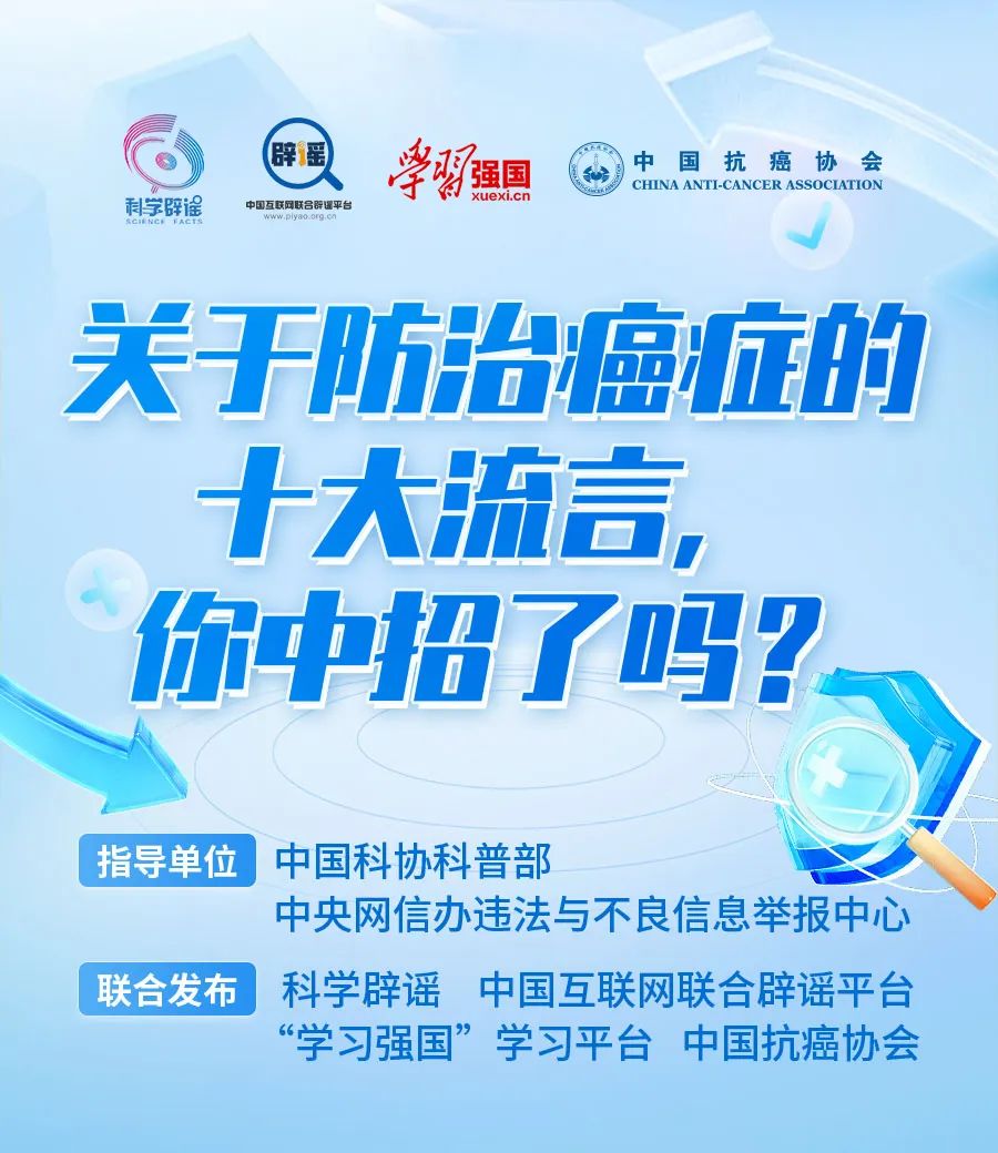 今天,科學辟謠聯(lián)合中國互聯(lián)網(wǎng)聯(lián)合辟謠平臺、“學習強國”學習平臺、中國抗癌協(xié)會,針對10個廣為流傳的有關“防治癌癥”的流言進行解讀,快看看你中招了沒?