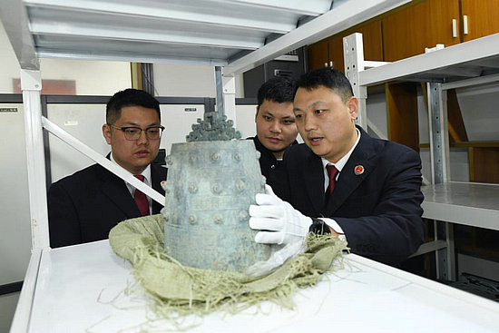 圖為檢察機(jī)關(guān)辦案人員查看被盜的青銅編鐘。(淮安市檢察院供圖)