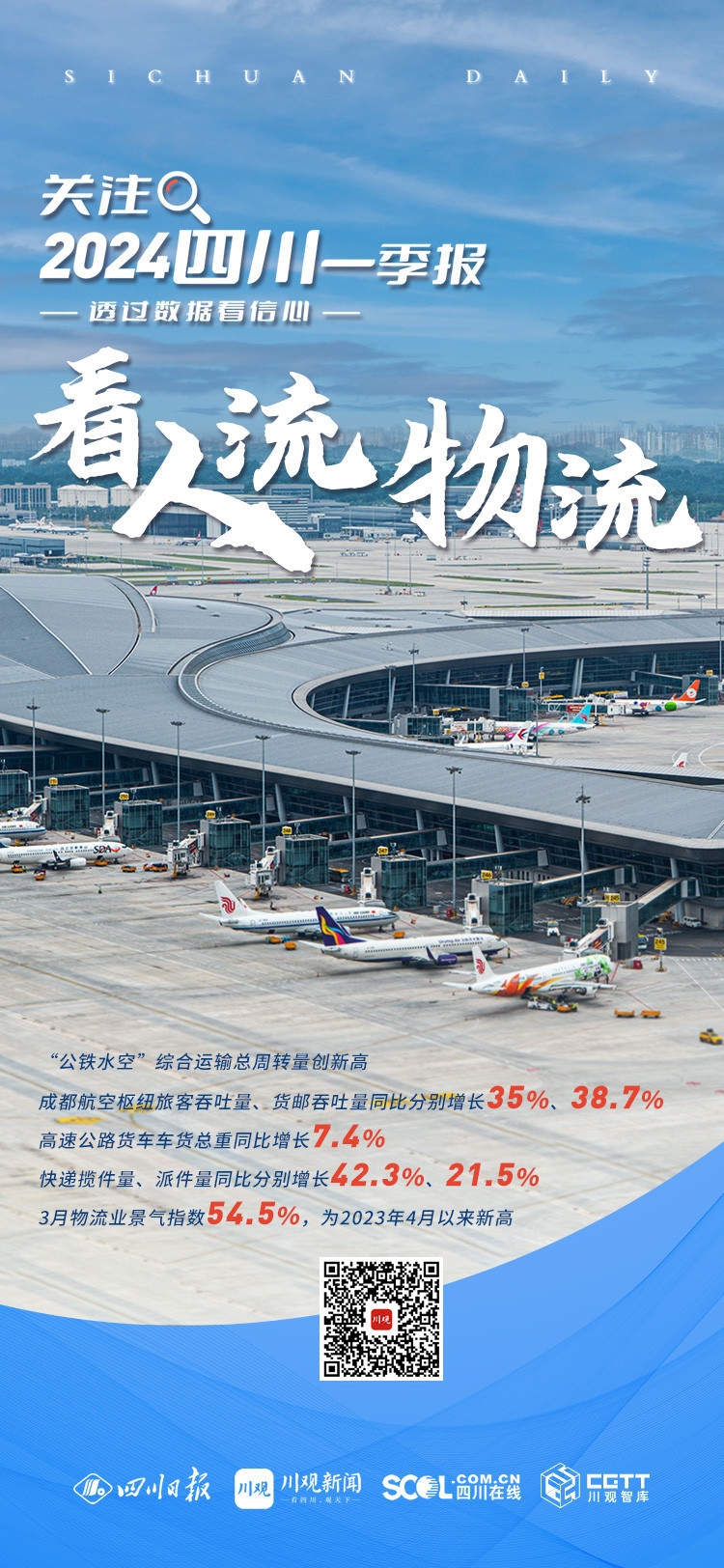 不僅僅是航空。數(shù)據(jù)顯示,今年一季度,四川交通運輸、倉儲和郵政業(yè)增長10.1%,3月物流業(yè)景氣指數(shù)54.5%,為2023年4月以來新高。