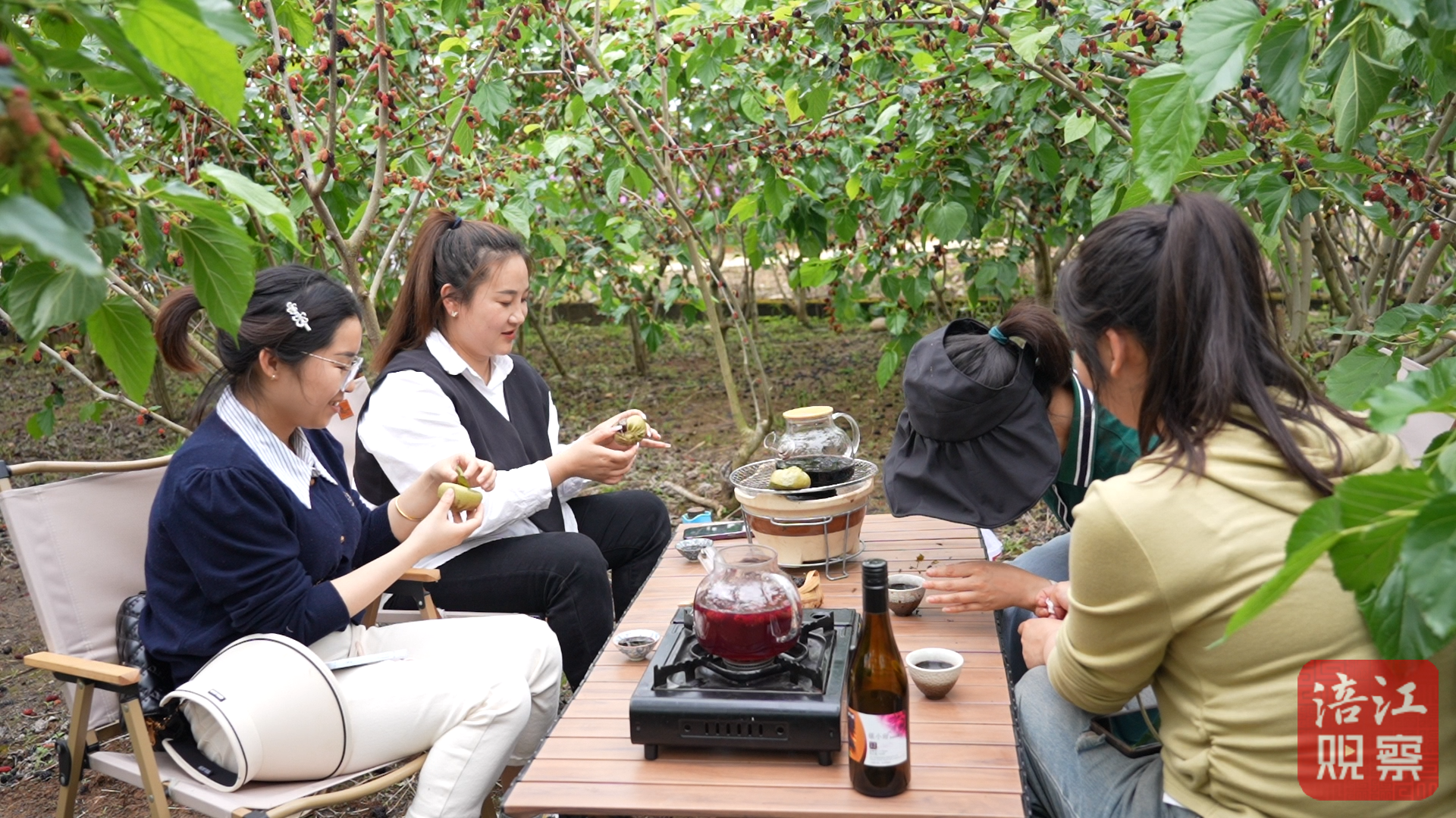 在果桑園的一角,老板娘正在忙碌地制作桑葚茶。她用新鮮的桑葚,為游客們精心烹煮出香濃的桑葚茶。此外,她還準備了桑葚包子、桑葚酒等特色美食,讓游客們在品味桑葚美味的同時,也能領略到鄉(xiāng)村的獨特風情。