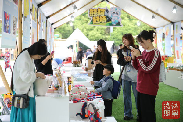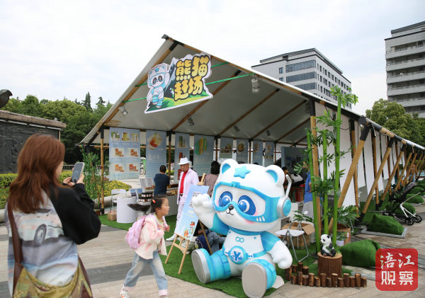 左側(cè)是熊貓趕場展館,不僅有蜂巢蜜、羊肚菌等綿陽老字號,黃金松花皮蛋、三臺面塑、三臺布藝等綿陽非物質(zhì)文化遺產(chǎn),平武風(fēng)干雞等地標(biāo)農(nóng)特產(chǎn)品,還設(shè)置了涪江流域川渝九城文化旅游展示區(qū),門口還有只可愛的“熊貓”歡迎你來打卡。