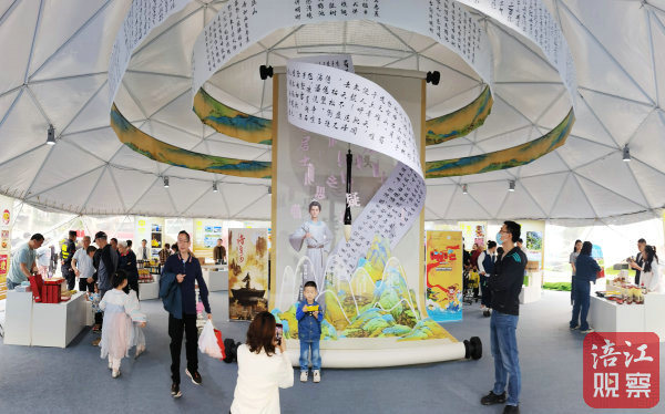 走進此次活動主題縣江油館,映入眼簾的是太白立體畫軸創(chuàng)意造型,畫軸以李白詩詞為屏,畫軸前方為立體的奇山異水造型,向杭州市民展示“蜀道太白鄉(xiāng),詩意棲居地”的浪漫江油。不少前來觀展的杭州市民,忍不住拿起手機與“李白”合影。