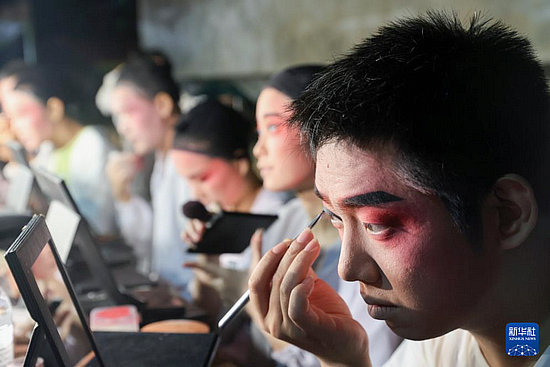 5月2日,在海南省??谑袔X梅村,陳科翰(右一)在演出前化妝。