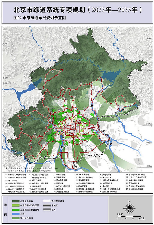 北京市級(jí)綠道布局規(guī)劃示意圖。(圖片來(lái)自《北京市綠道系統(tǒng)專項(xiàng)規(guī)劃(2023年—2035年)》)。