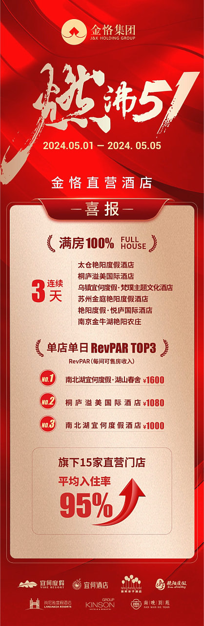 5月1日-5日,集團旗下太倉艷陽度假酒店、桐廬溢美國際酒店、烏鎮(zhèn)宜何度假·梵璞主題文化酒店、蘇州金庭艷陽度假酒店、艷陽度假·悅廬國際酒店、南京金牛湖艷陽農(nóng)莊等直營酒店連續(xù)3天滿房率100%。